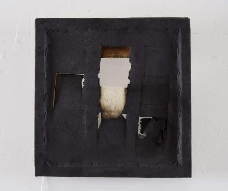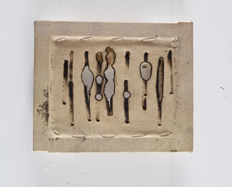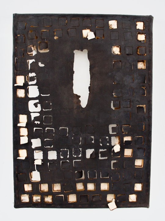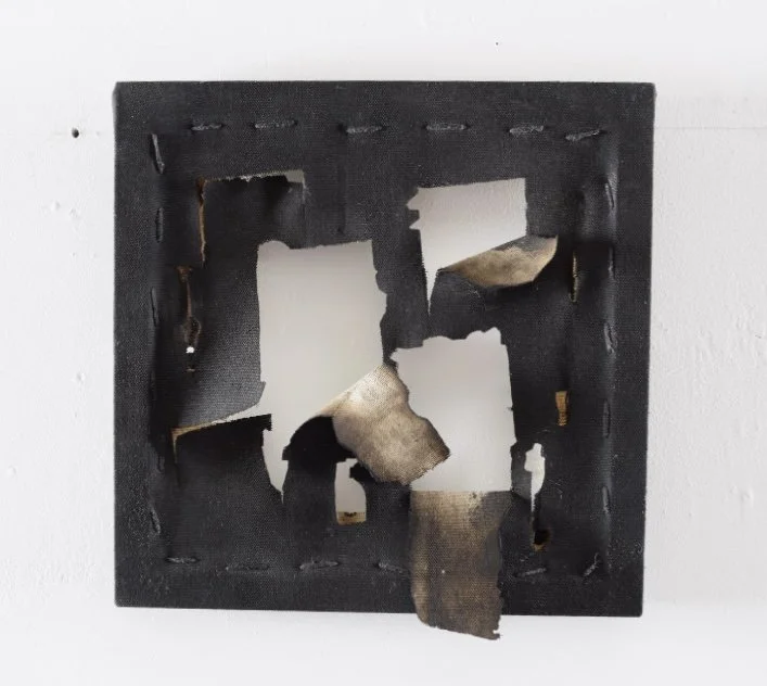 canvas, wooden frame, burn marks