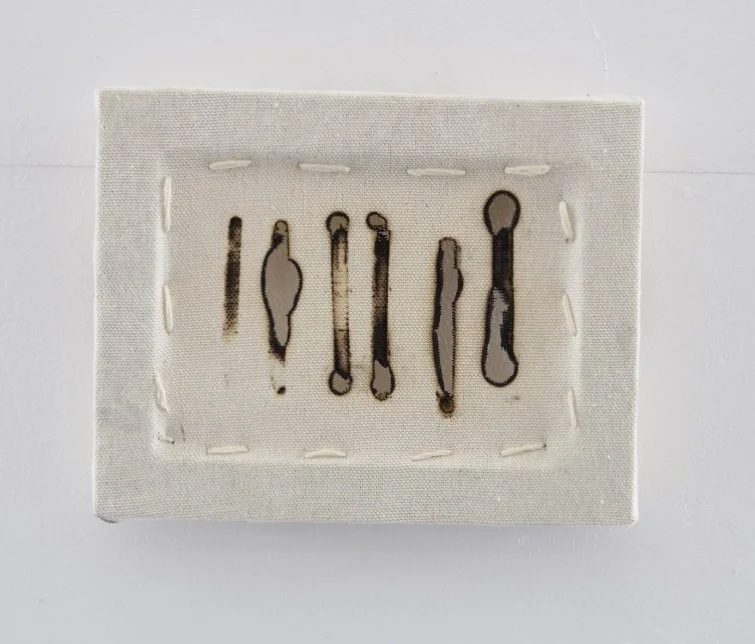 canvas, tea dye, wooden frame, burn marks
